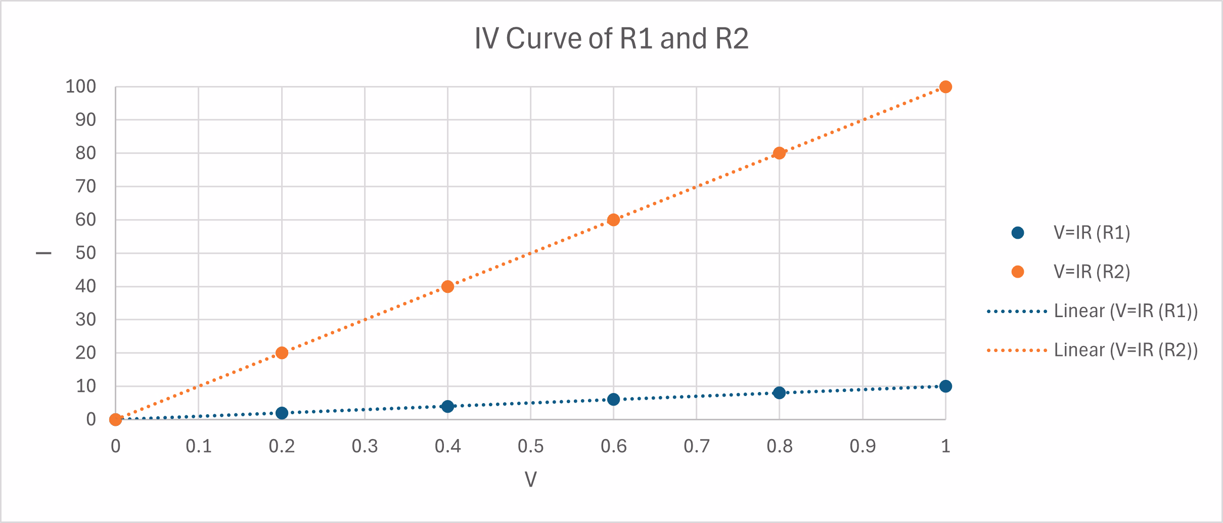 我们知道 IV 曲线表示 y 轴为 I,x 轴为 V。因此它必须是线性函数,因为 IV 没有幂次。