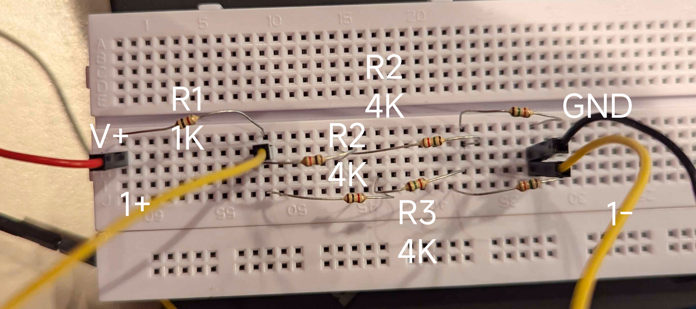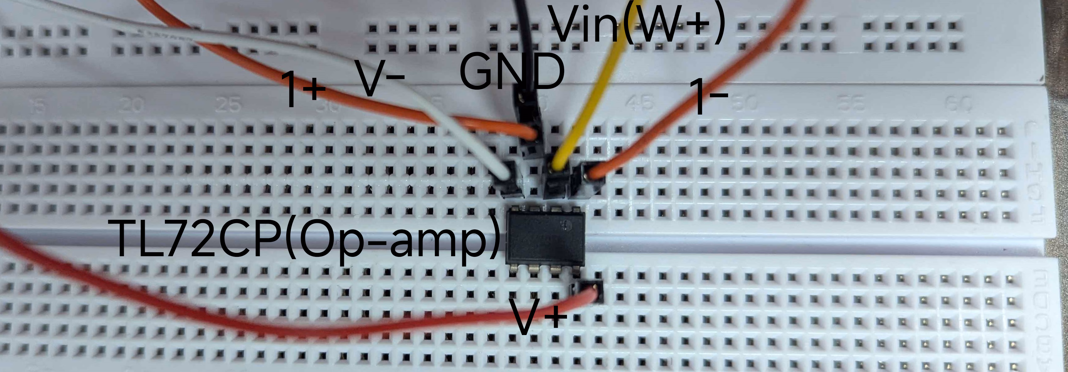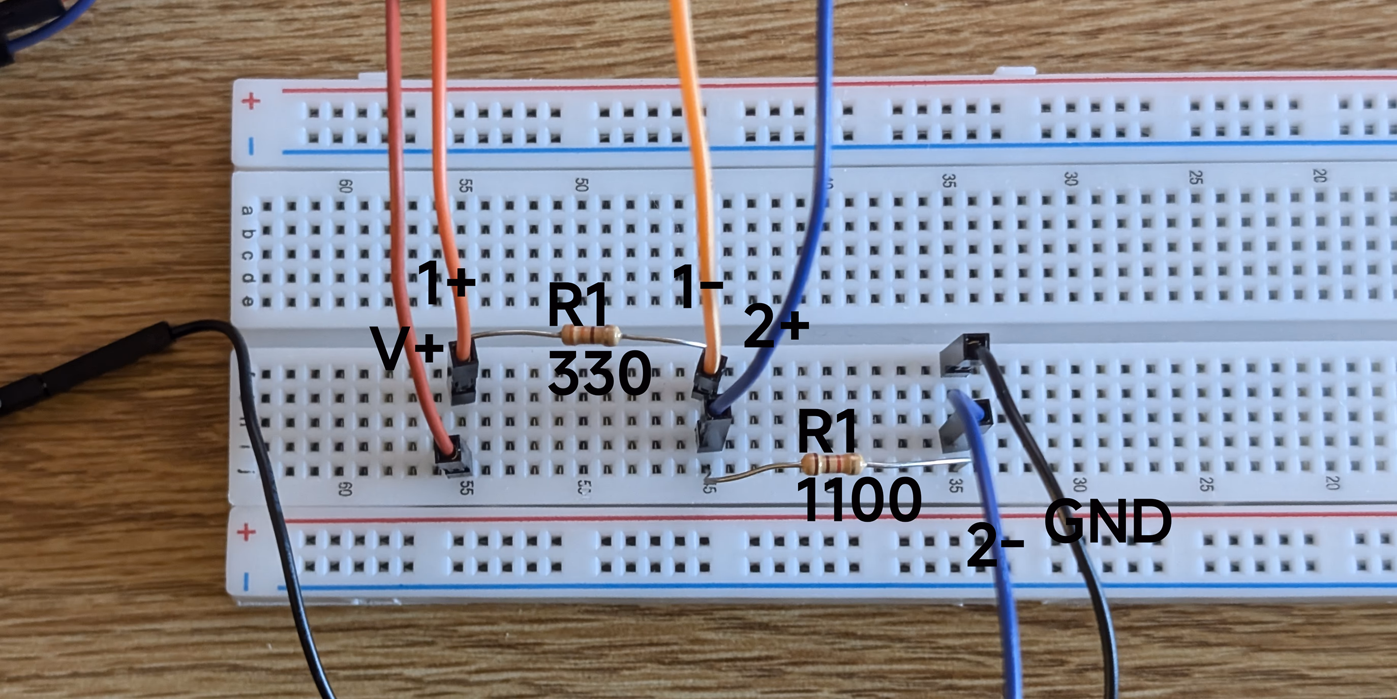 我们只改变了 R1,R2 的值。另外,很难在面包板上插表。因此我们在前面交叉了 V+ 电路