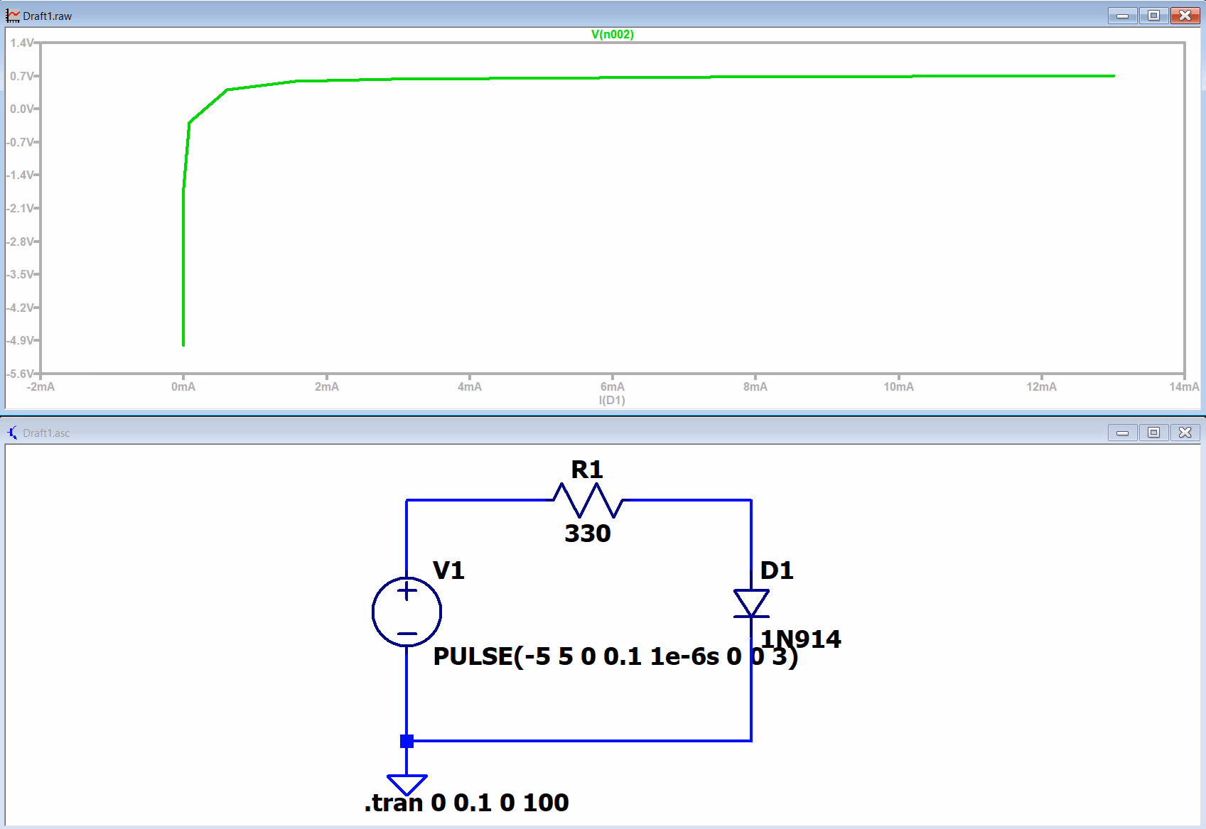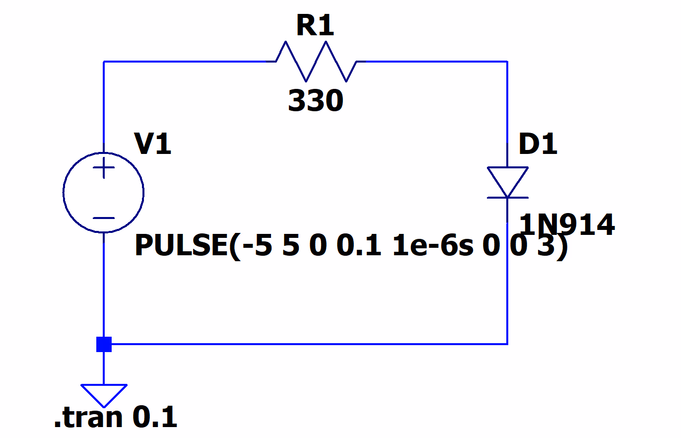 Vout={如果Vin<0V,Vout=−5V如果Vin>0V,Vout=5V我们的电源电压为 5V 和 −5V,输入信号是幅度为 1V 的正弦波,并且参考电压为 GND(即 0V)。