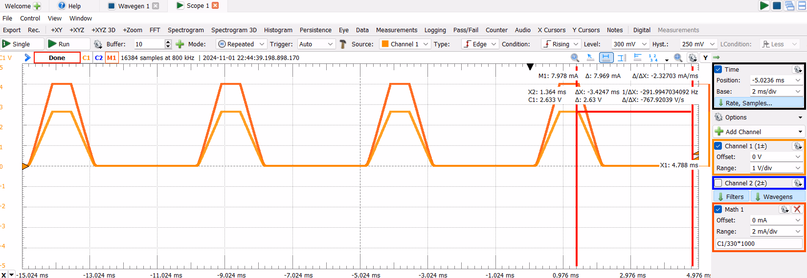 如我们所见,输出波形的形状与我们的模拟完全相同。仿真和测量中的输出波形幅度约为 1.75V,周期也相同。
