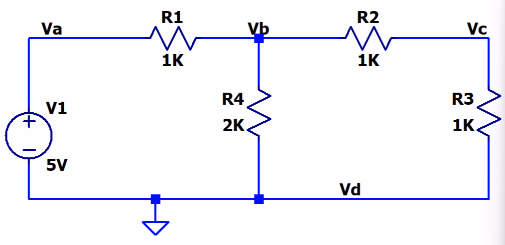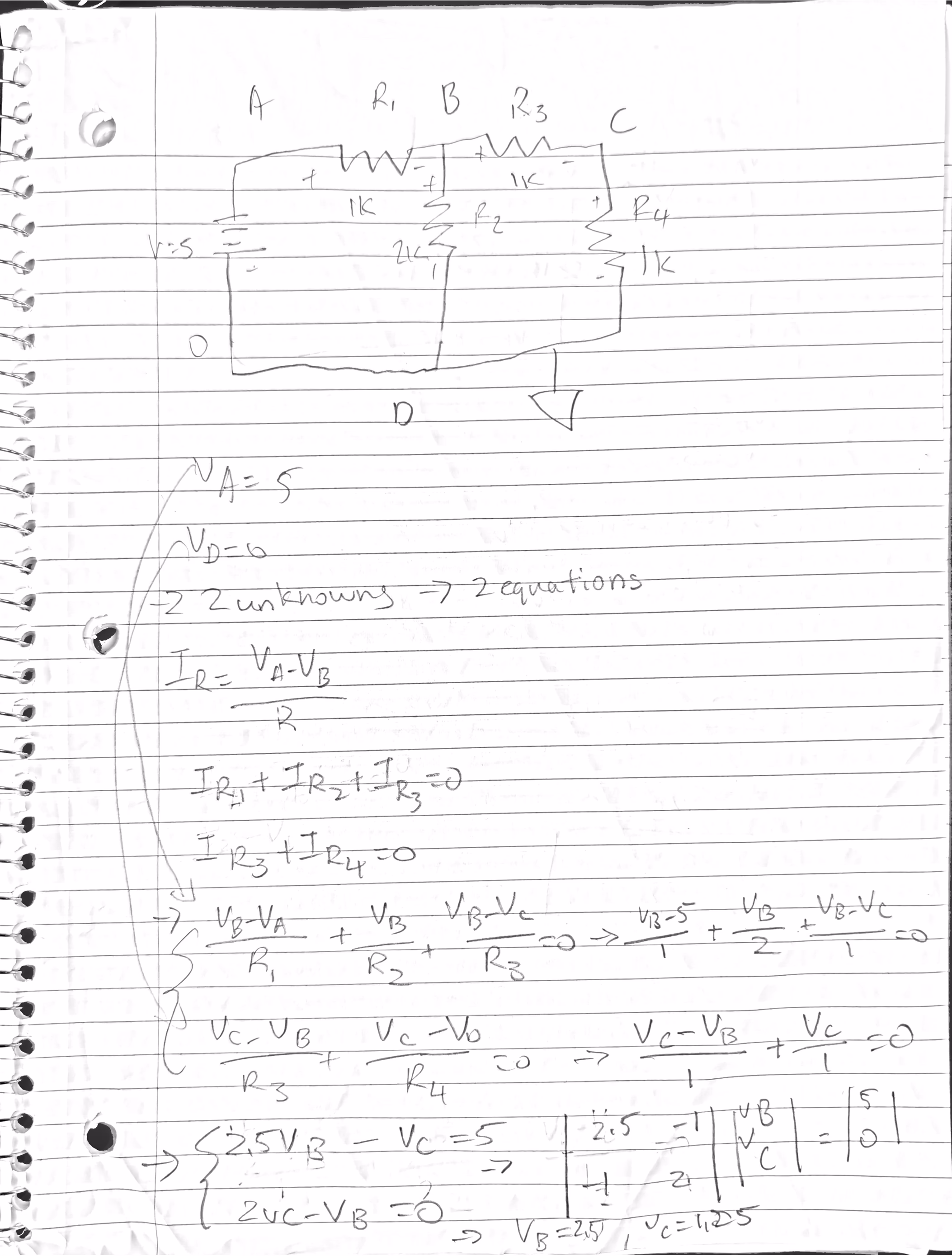 R3VC−VB+R4VC−VD=0代入已知值。给定 VA=5 和 VD=0,方程变为: